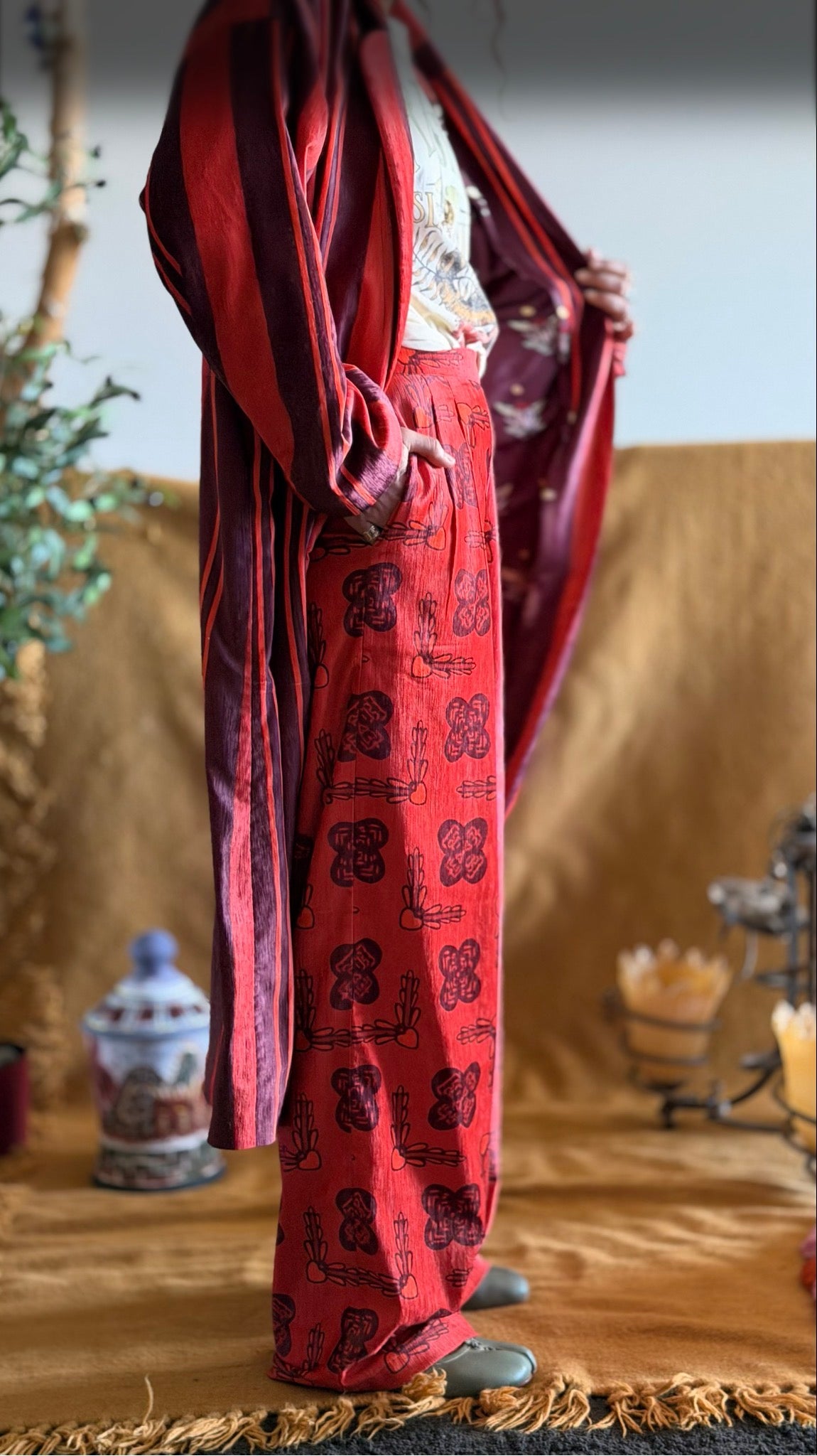 Bold, magnetic, and full of heat. A velvet high-waisted wide-leg trousers in a striking red print. it blends power and artistry in one look.